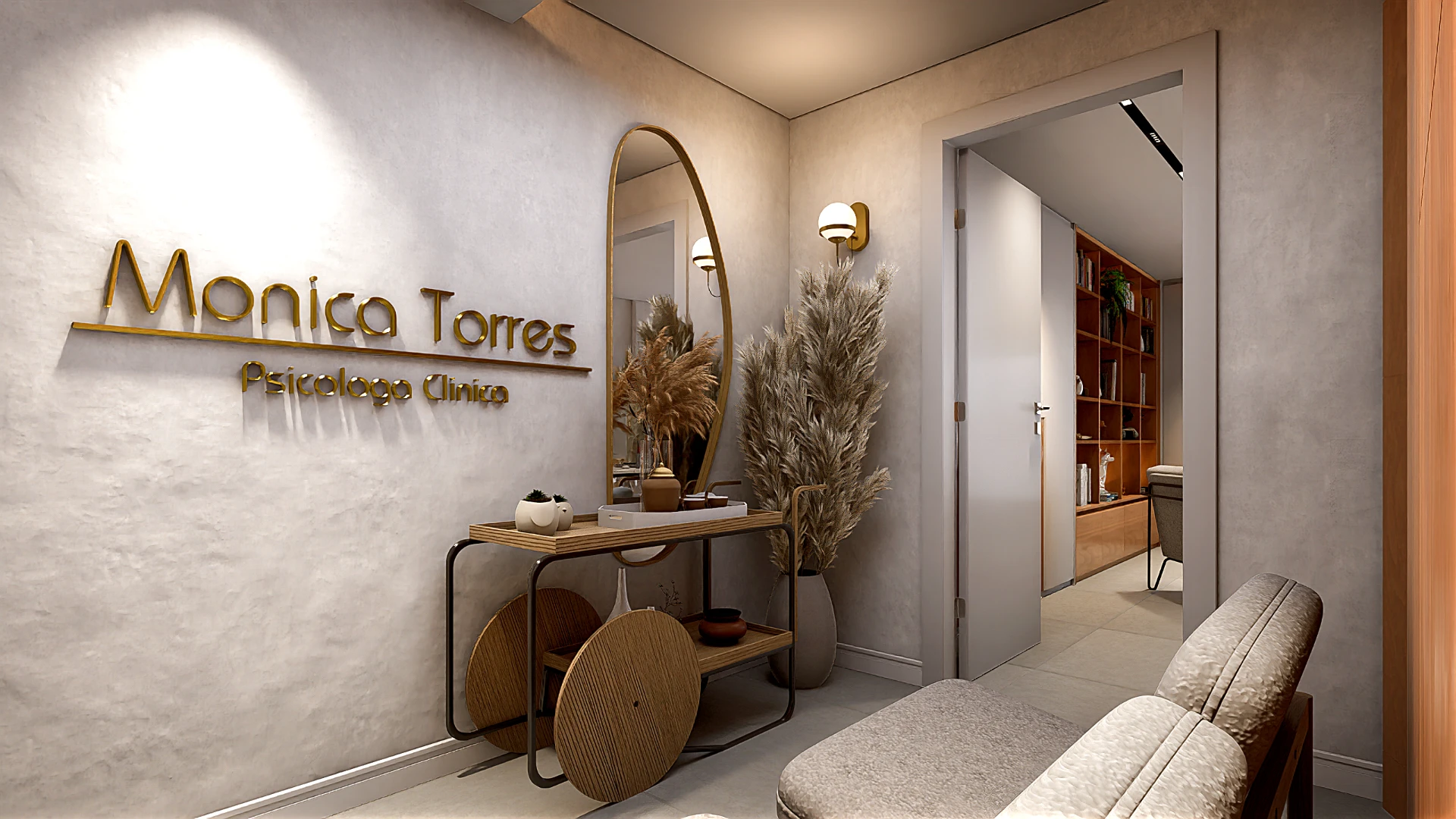 No projeto da clínica MT, procuramos alinhar os conceitos trazidos pela cliente ao projeto de interiores. A sala de consulta conta com um sofá confortável e duas poltronas. Assim, a cliente consegue alternar o estilo da consulta. Também conta com bancada de trabalho para consultas online. A estante é um elemento muito importante, pois se torna um ponto focal no processo de atendimento ao paciente. A recepção é completamente isolada dos demais ambientes e todas as paredes e portas receberam tratamento acústico adequado.