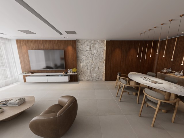 Projeto de design de interiores para apartamento no Noroeste, contemplando sala de estar, jantar e home office.